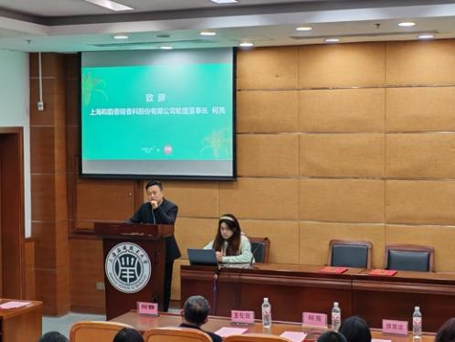 上海和韵香精香料有限公司轮值董事长何亮先生,也是香化学部优秀校友,致辞介绍了创业心路历程,并为学生介绍了本次调香竞赛的课题“花漾世界,绽放风华'',他鼓励学生脚踏实地,实践创新,争取成为中国优秀的调香师。他还提出为学部学生提供相应岗位和实习基地进行实习培训,助力中国本土调香事业的发展。